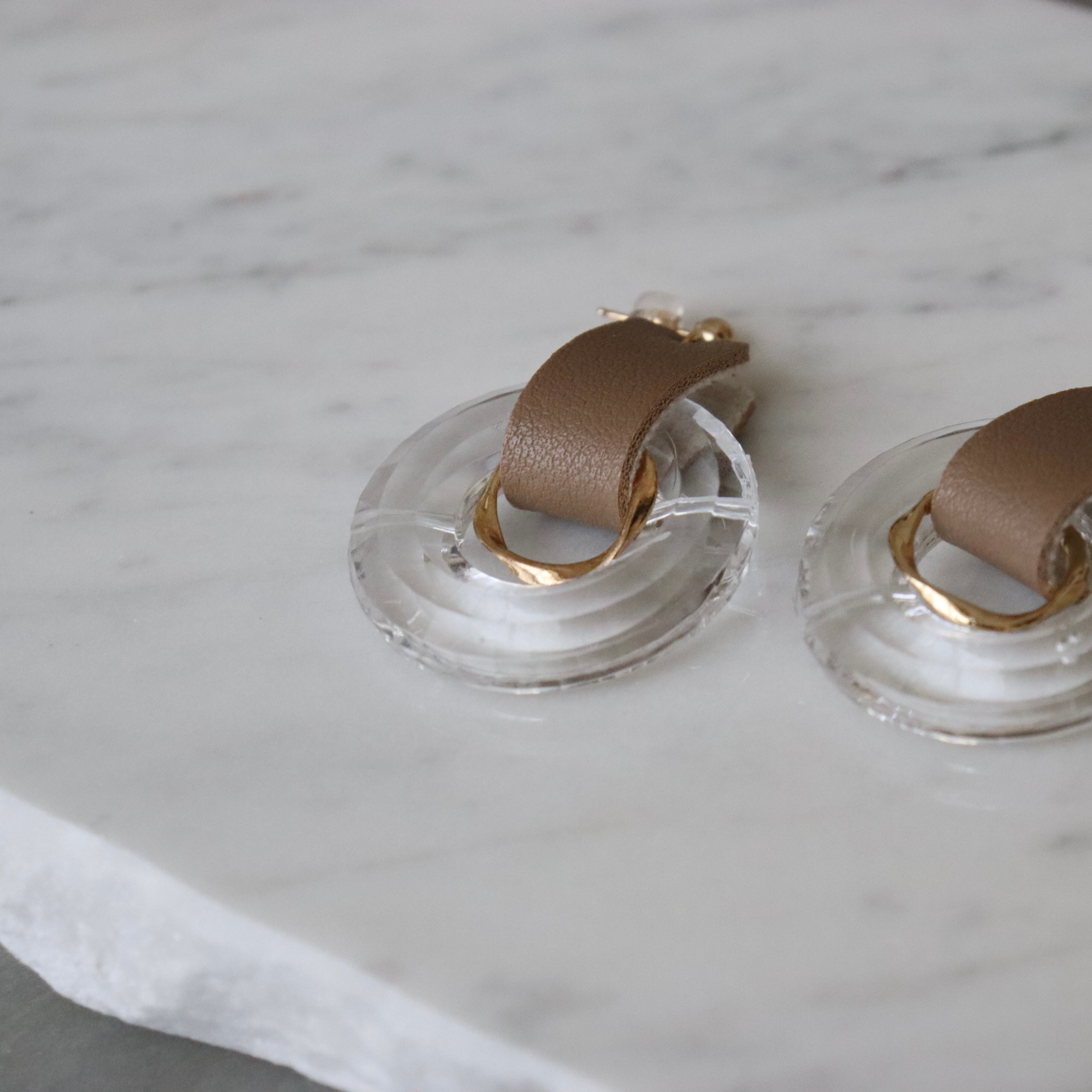 涼しげな印象のクリアアクリルパーツとレザーの合わせがオシャレ感UPのデザイン。〝beige〟は肌馴染みもよく服にも合わせやすいです。