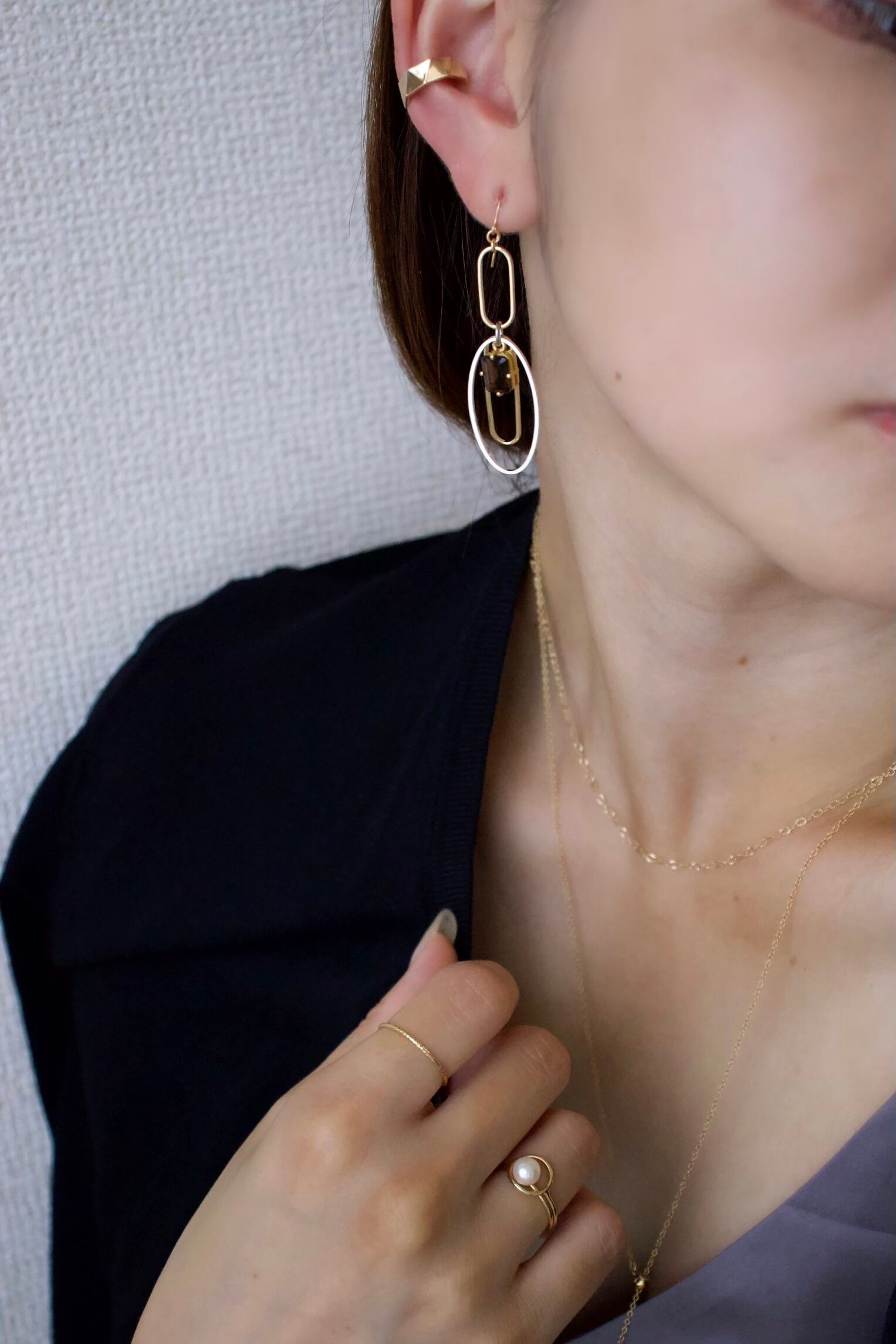 イヤーカフや小さめのスタッドピアスと重ね付けするとよりおしゃれで洗練されたイメージになります。