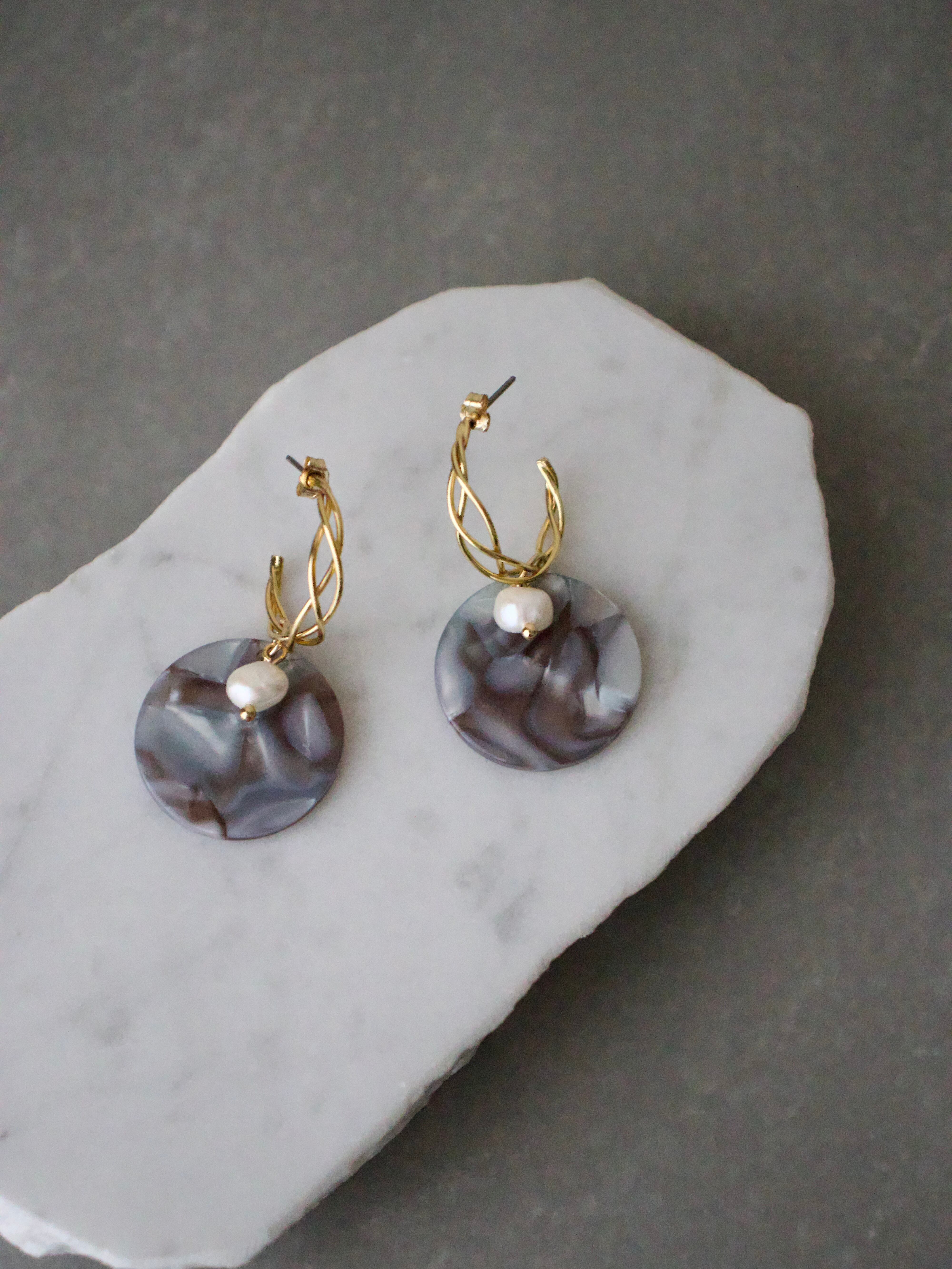 細い線が交差したピアス/イヤリングが珍しく、しなやかで女性らしい印象。ブルーグレーのニュアンスマーブルが大人っぽく見せてくれ、揺れるパールで可愛さをプラスしたデザイン。