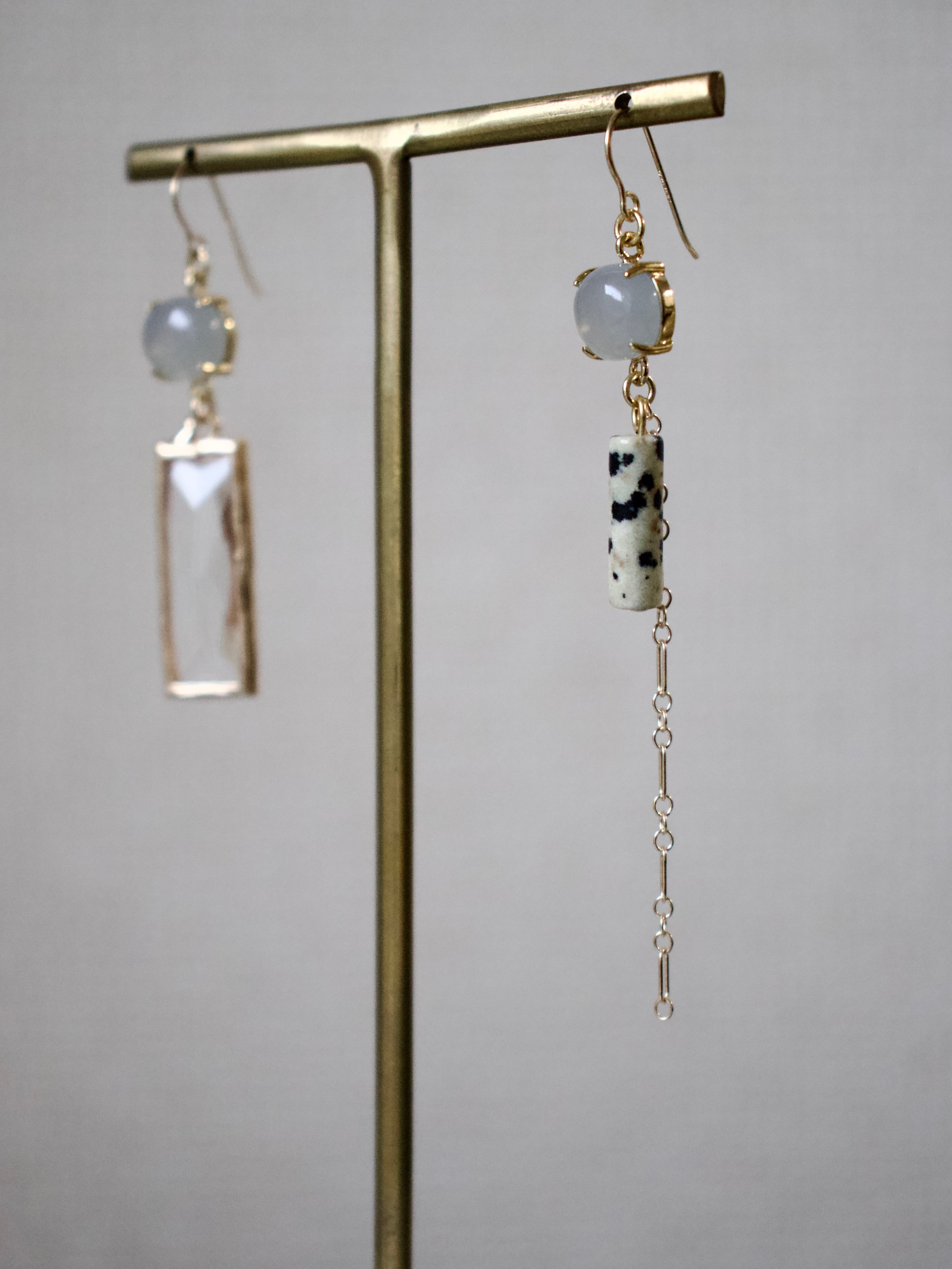 ぷっくりしたブルーグレーカラーのガラスの存在感をしっかり残したくてなるべくシンプルなデザインに...と思い完成したのがアシンメトリーデザイン。