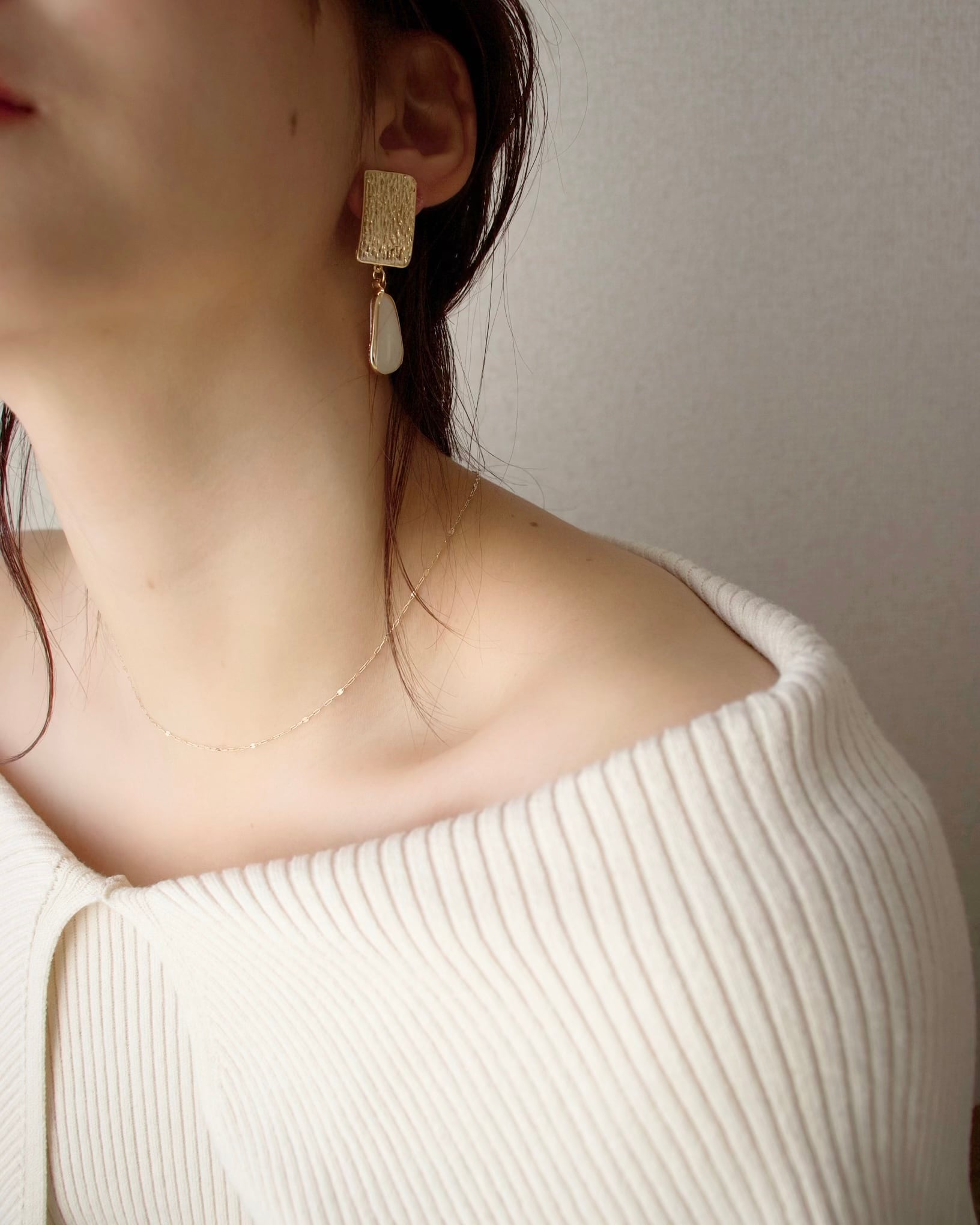 曲線を取り入れ、角度によって表情の変わる柔らかい雰囲気のシェルを合わせることで印象の強いボタンも女性らしいアクセサリーに。